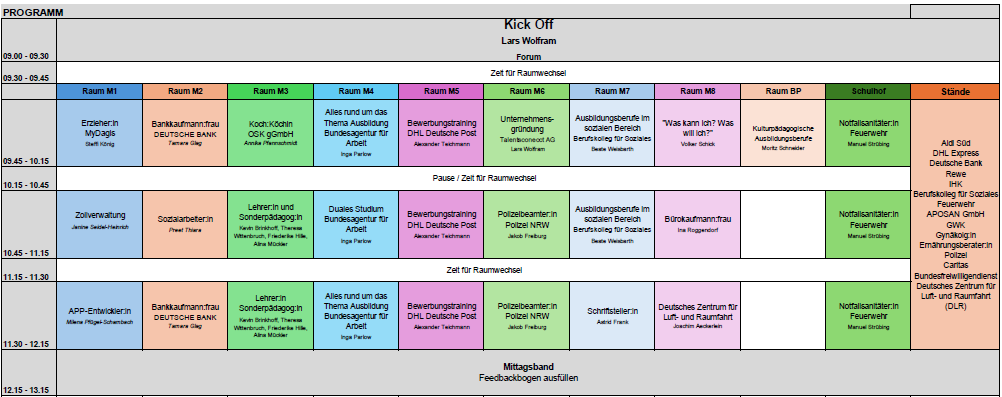 Statt Unterricht in den Lerngruppen lernen die Schüler:innen über den Tag verteilt in Input-Sessions und Workshops sowie an Ausstellungsständen unterschiedliche Berufe und Ausbildungswege kennen, können Fragen stellen und wertvolle Kontakte knüpfen. Start ist um 09:00 Uhr mit einer inspirierenden Rede von Lars Wolfram (Talentsconnect AG), die alle Teilnehmenden auf die BOM einstimmt, ermutigt, motiviert, inspiriert und zum Nachdenken anregt.
